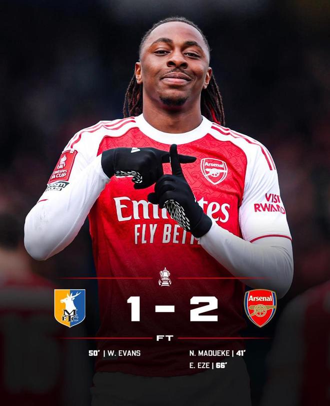 仅仅过了3分钟,埃泽禁区前沿接球后果断起脚抽射,皮球贴地钻入远角,阿森纳2-1再次取得领先。最终,枪手最终2-1淘汰曼斯菲尔德,顺利挺进足总杯八强。